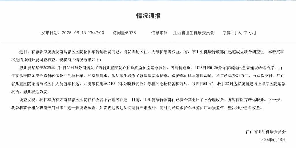 6 月 18 日,江西省卫健委对此事发布通报,江西省儿童医院无符合跨省转运条件的救护车,在诊治医生联系了赣医医院救护车后,医院派出了两名医护人员随车护送,并携带使用 ECMO(体外膜肺氧合)等相关抢救设备和药品。