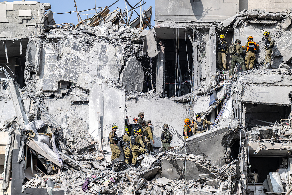 当地时间2025年6月24日,以色列贝尔谢巴,伊朗发射的导弹袭击了该市,救援队在一栋严重受损并部分倒塌的建筑内进行搜救作业。