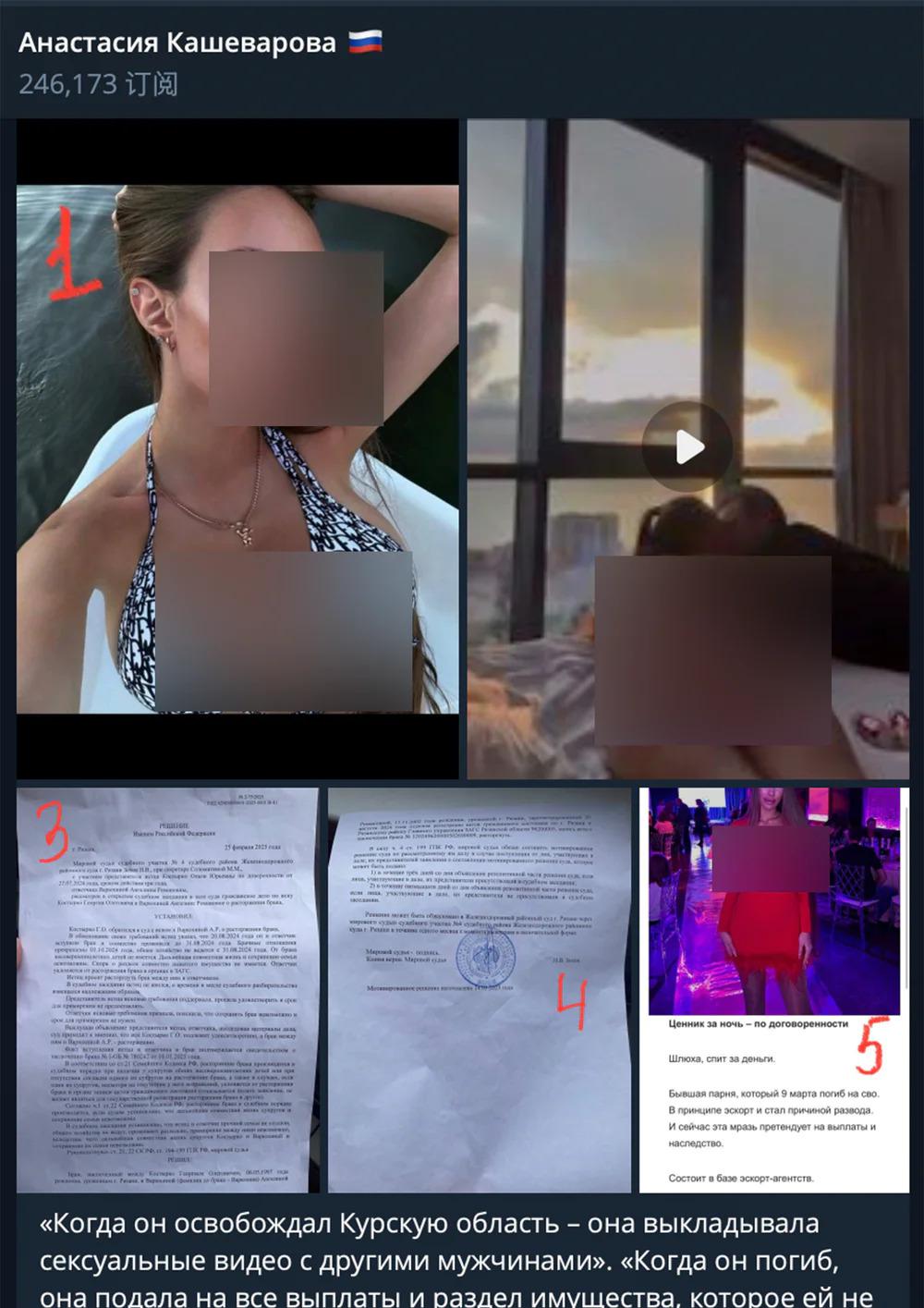 " 当他在解放库尔斯克州的时候,她却在社交网络上传和其他男人的色情视频。当他牺牲后,她立即申请领取所有的死亡赔偿金,并要求分割本不属于她的财产,然后就和情人一起去了埃及。"