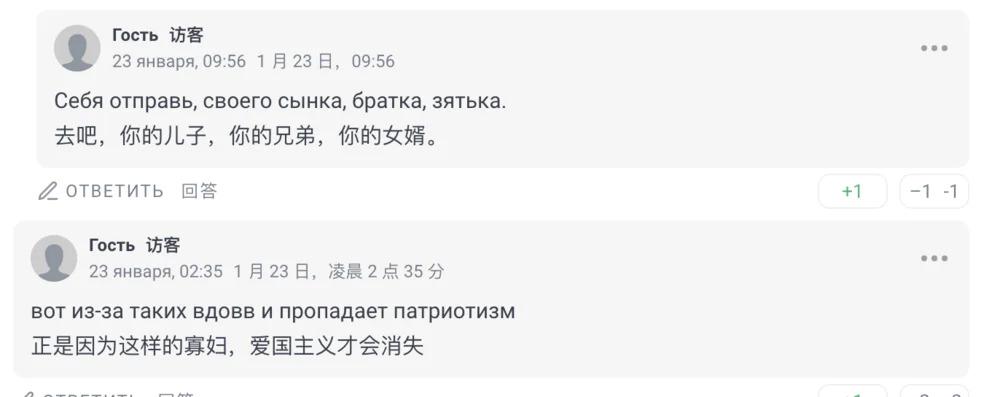 一个证据是,在留言区里总能看见这样的留言:" 就是这样的寡妇,俄罗斯的爱国主义才会消失。"