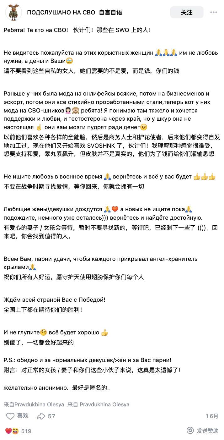 现在,这个恐怖的称呼笼罩在俄罗斯所有女性头上,只要你被质疑有为钱跟士兵结婚的嫌疑,就有被套上这个称呼,在 telegram 频道示众的风险。