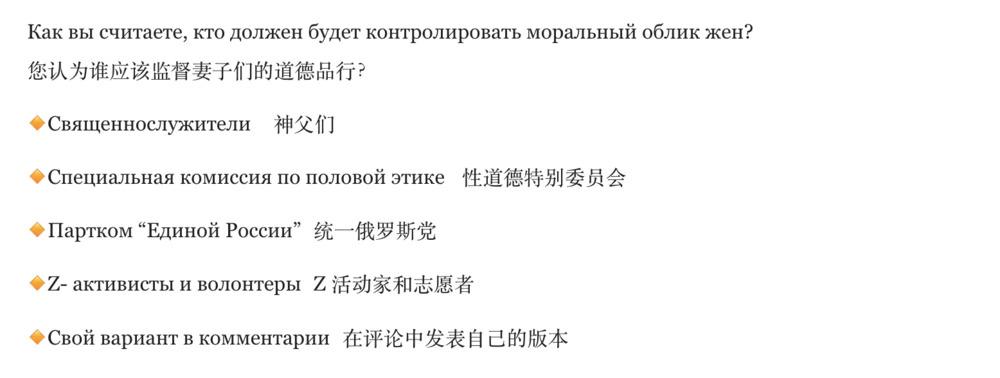 某俄罗斯媒体策划了一个讨论,问人民群众妻子的道德品行该由谁来监督