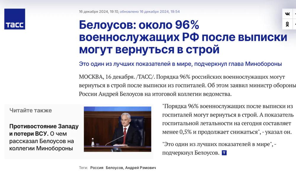 塔斯社报道,别洛乌索夫:约 96% 的俄罗斯联邦军人伤愈后可以重返现役