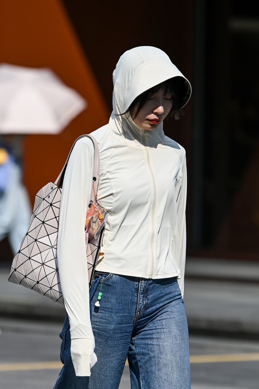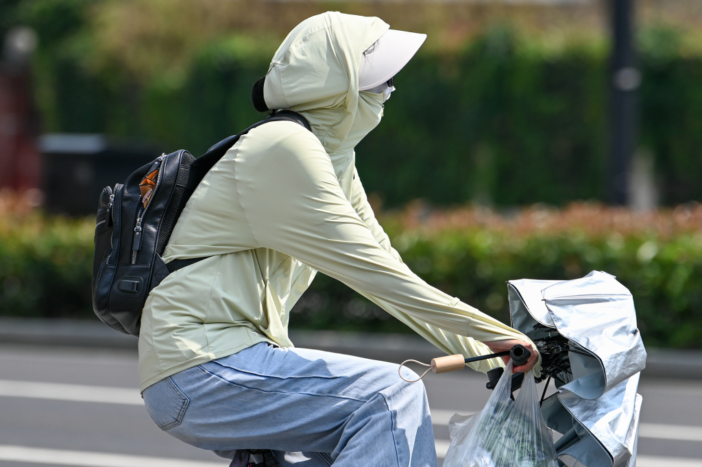 2025年6月27日,上海,市民穿着防晒服出行。澎湃新闻记者 朱伟辉 图
