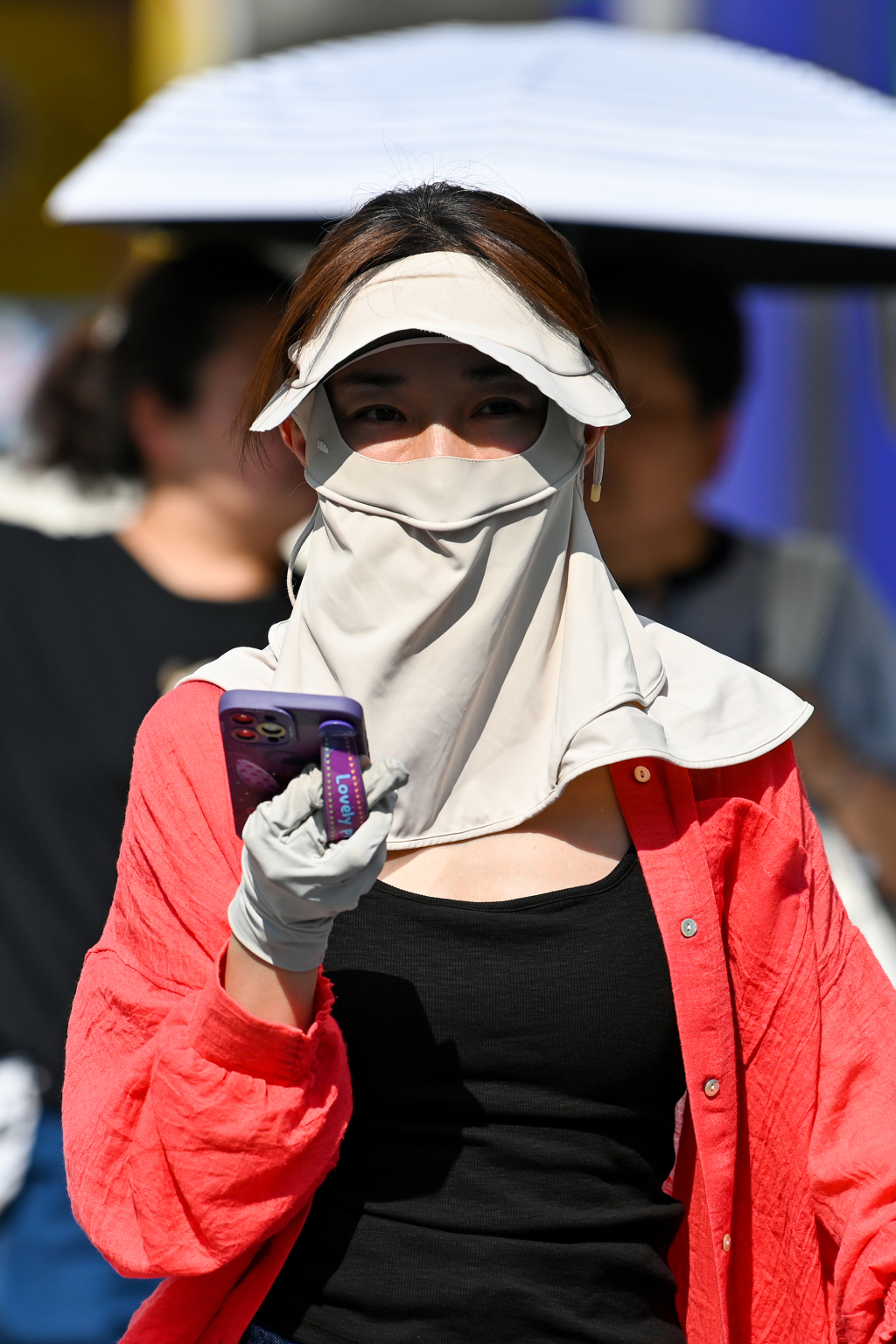 2025年6月27日,上海,市民全副武装防晒出行。澎湃新闻记者 朱伟辉 图
