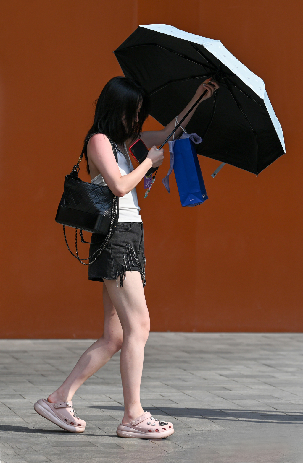 2025年6月27日,上海,行人用手机遮挡阳光。澎湃新闻记者 朱伟辉 图