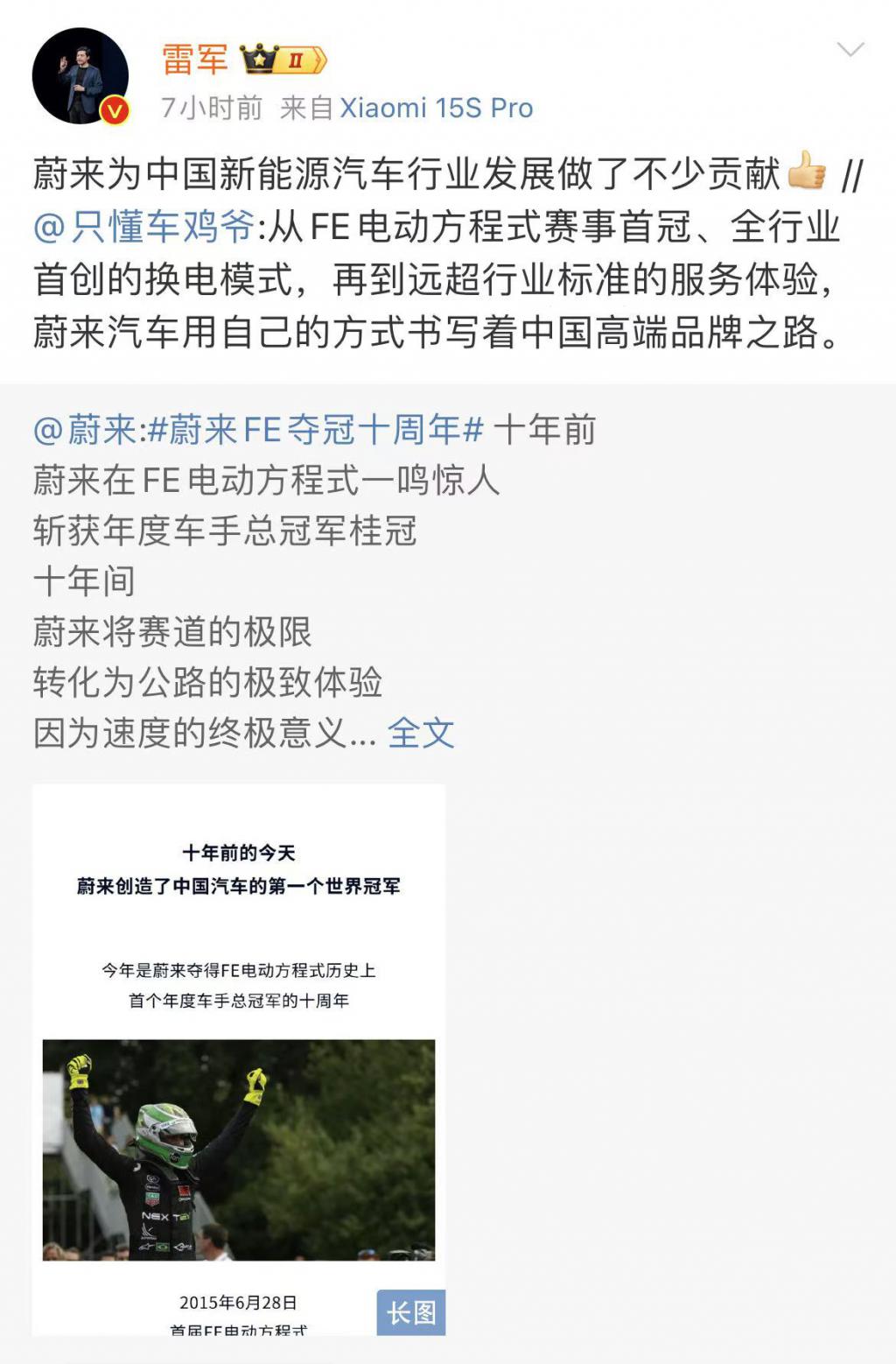 首页 > 生活 雷军:蔚来为中国新能源汽车行业发展做了不少贡献 ZAKER 科技消息 6 月 29 日,蔚来官方微博发文庆祝蔚来 FE 夺冠十周年,雷军转发该微博称赞道:蔚来为中国新能源汽车行业发展做了不少贡献。随后蔚来 CEO 李斌转发回复:一起加电!