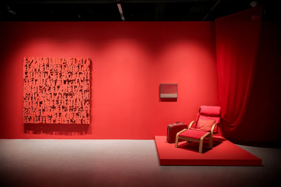 脚手架、安全帽、黑垃圾袋、白测试棒……现场五花八门、相互离合的物料,是李向阳一生亲历的物证。还有那些红色私人物品:红领巾、红奖状、红宝书、红袖章、红鞭炮、红中华、结婚证、旅行箱……解密了李向阳的人生本色。