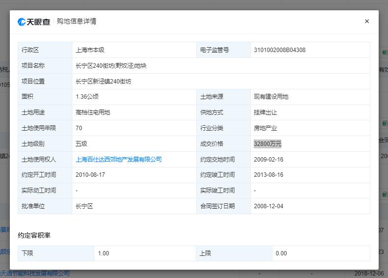 据天眼查,百仕达确实通过挂牌出让方式,以 3.28 亿元购入了长宁区新泾镇 240 街坊地块土地使用权,合同签订日期为 2008 年 12 月 4 日。