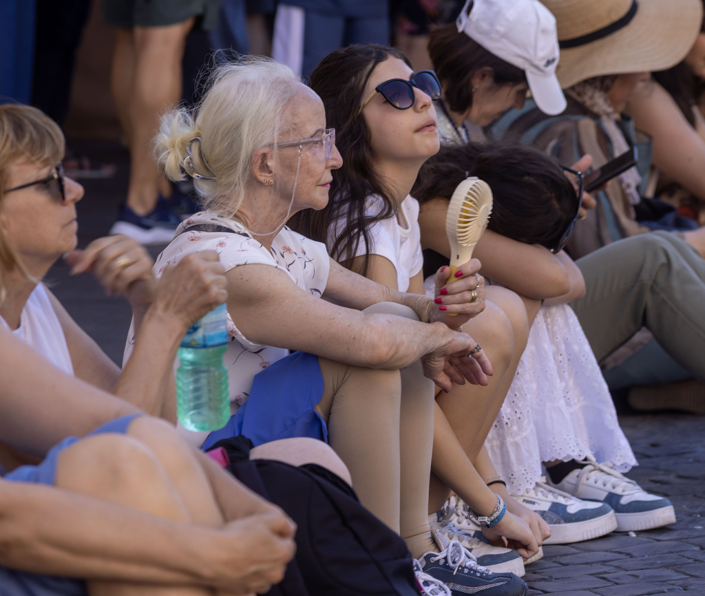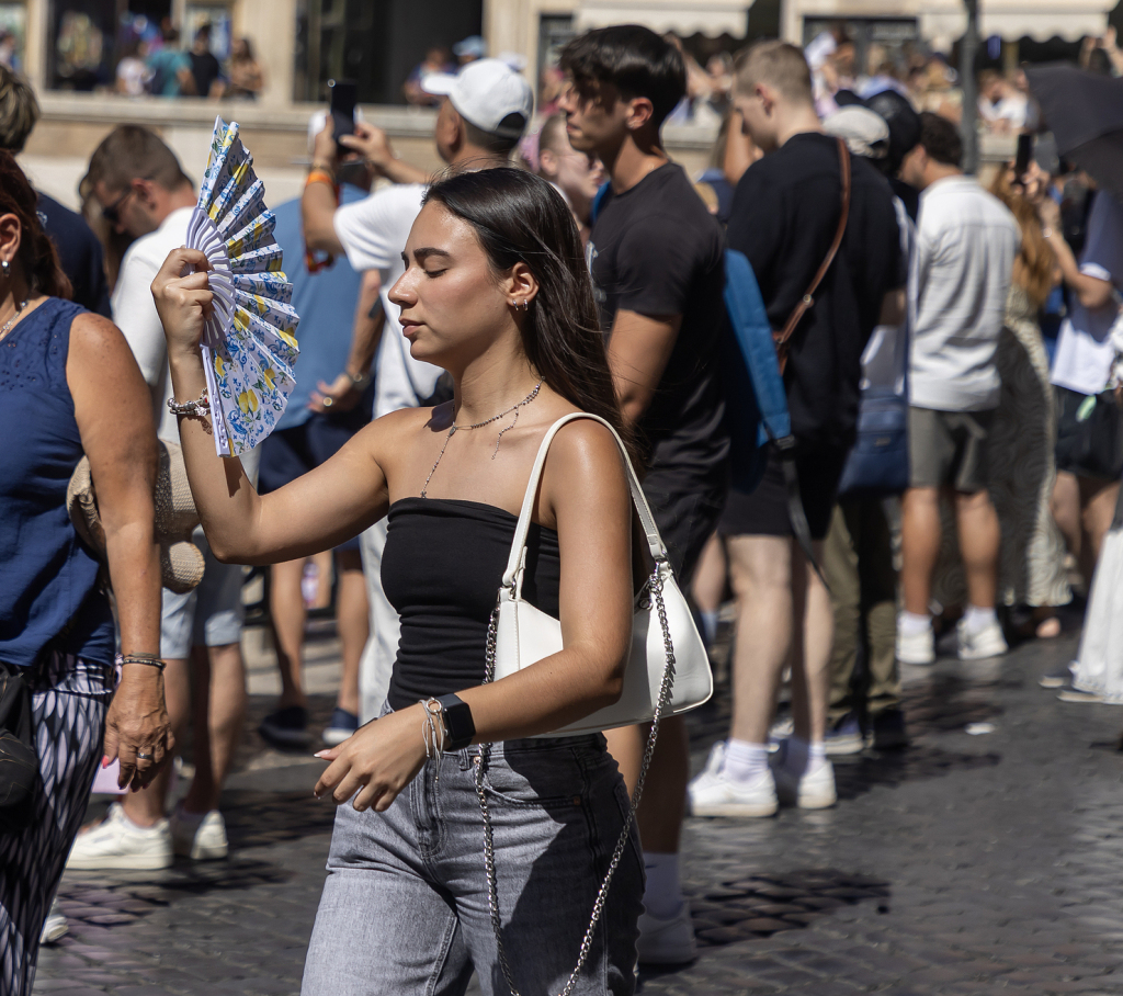 当地时间2025年6月30日,意大利罗马,游客在热浪中扇扇子。