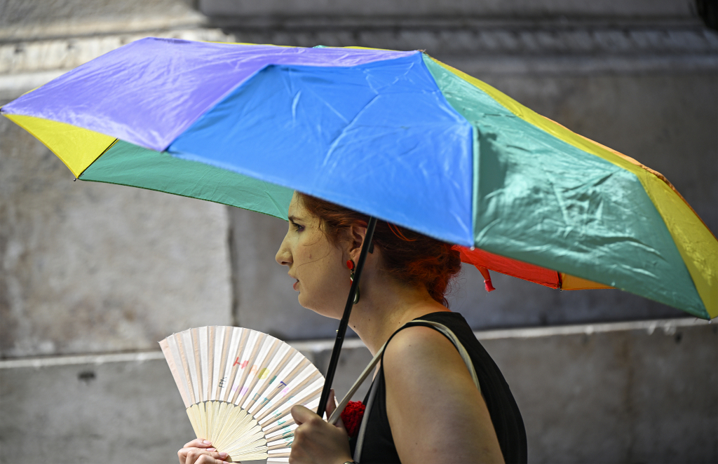 当地时间2025年6月30日,意大利罗马,游客撑伞遮阳。当日,罗马受到热浪侵袭。