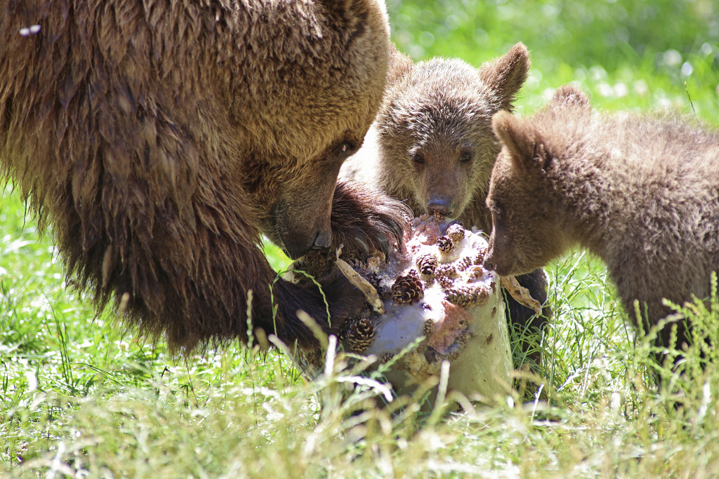 当地时间2025年6月30日,德国萨克森-安哈尔特州塔勒,高温天气下,棕熊和它的幼崽享用冰淇淋解暑。