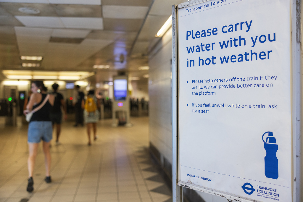当地时间2025年6月30日,英国伦敦,一块指示牌提醒行人在热浪期间随身携带饮用水。