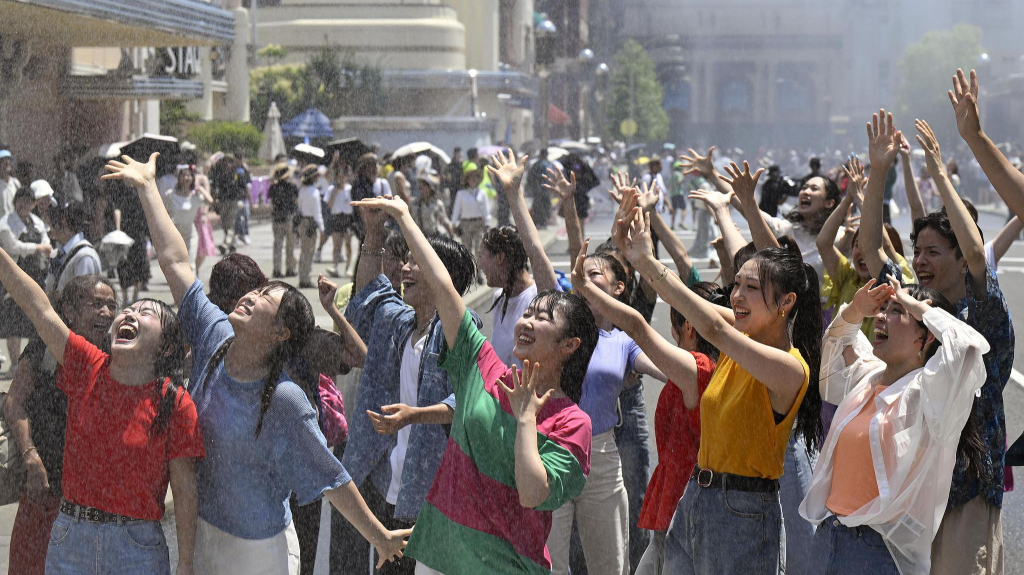 当地时间2025年6月30日,日本大阪,夏季高温持续,人们在享受被水雾喷洒。