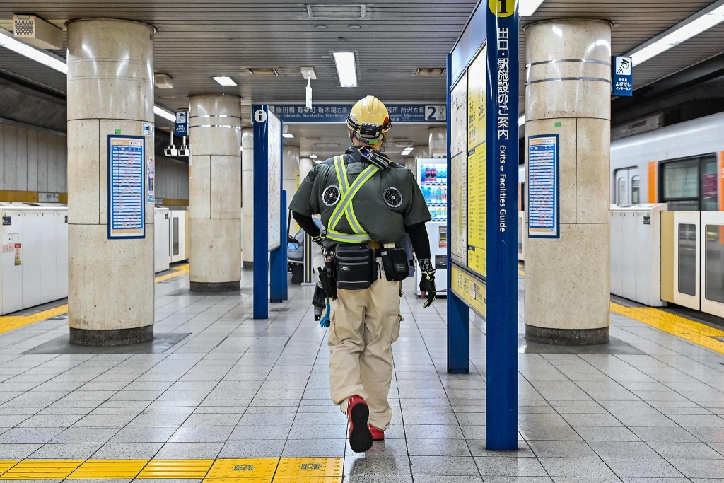 当地时间2025年7月1日,日本东京市中心,一名穿着内置电池风扇夹克的工人在火车站内行走。这种夹克可以帮助工人在夏季高温中保持凉爽。