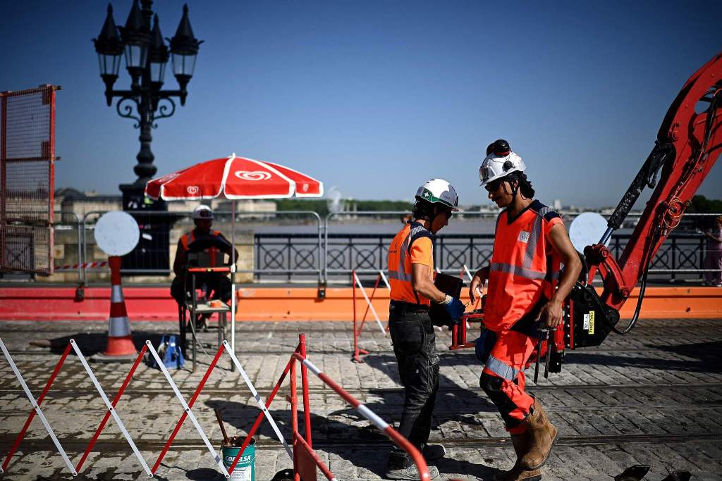当地时间2025年6月30日,法国波尔多,热浪来袭,工人们在皮埃尔桥的加固工地上施工。法国已连续数日遭受高温炙烤,部分地区气温高达44摄氏度。