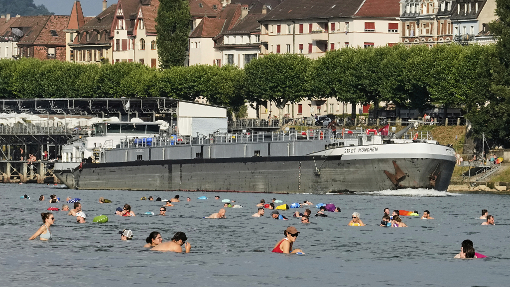 当地时间2025年6月30日,瑞士巴塞尔市中心,热浪来袭,人们在莱茵河中纳凉。