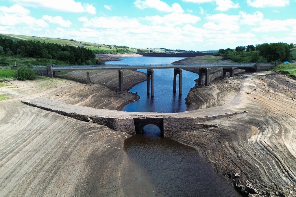 当地时间2025年6月30日,英国里彭登,高温持续致贝廷斯水库水位下降,一座古老的驮马桥显露出来。这座桥被认为建于14世纪,于20世纪50年代水库蓄水时被淹没。