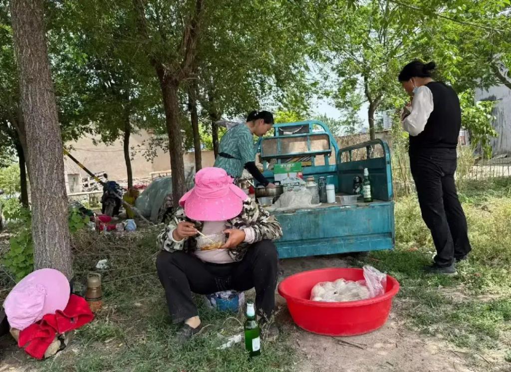 ●拔蒜女工们在地头阴凉处吃午饭。殷盛琳 摄