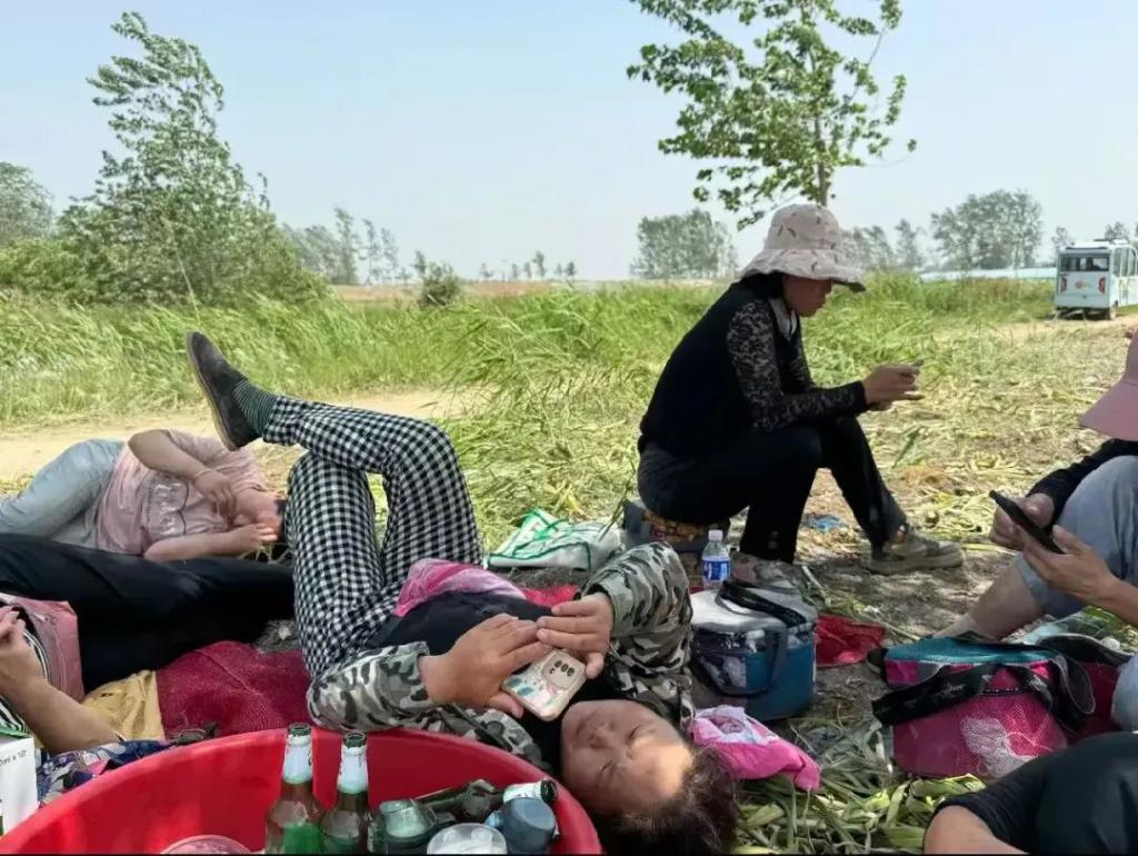 这天中午,气温攀升到37度,阳光像烧红的针扎下来——人在地里站一会儿,裸露的皮肤会留下灼痛的红色印记。郑红的上衣早被汗水浸透,紧贴皮肉。她不停用帽沿擦脸,避免汗水流进眼睛。为了缓解燥热,她把防晒帽用水浸湿,但很快就被晒干。她感到头胀眼花,不得不停下到阴凉处休息。田埂边的塑料水杯滚烫,水也是温热的,喝下反而令人更想吐。