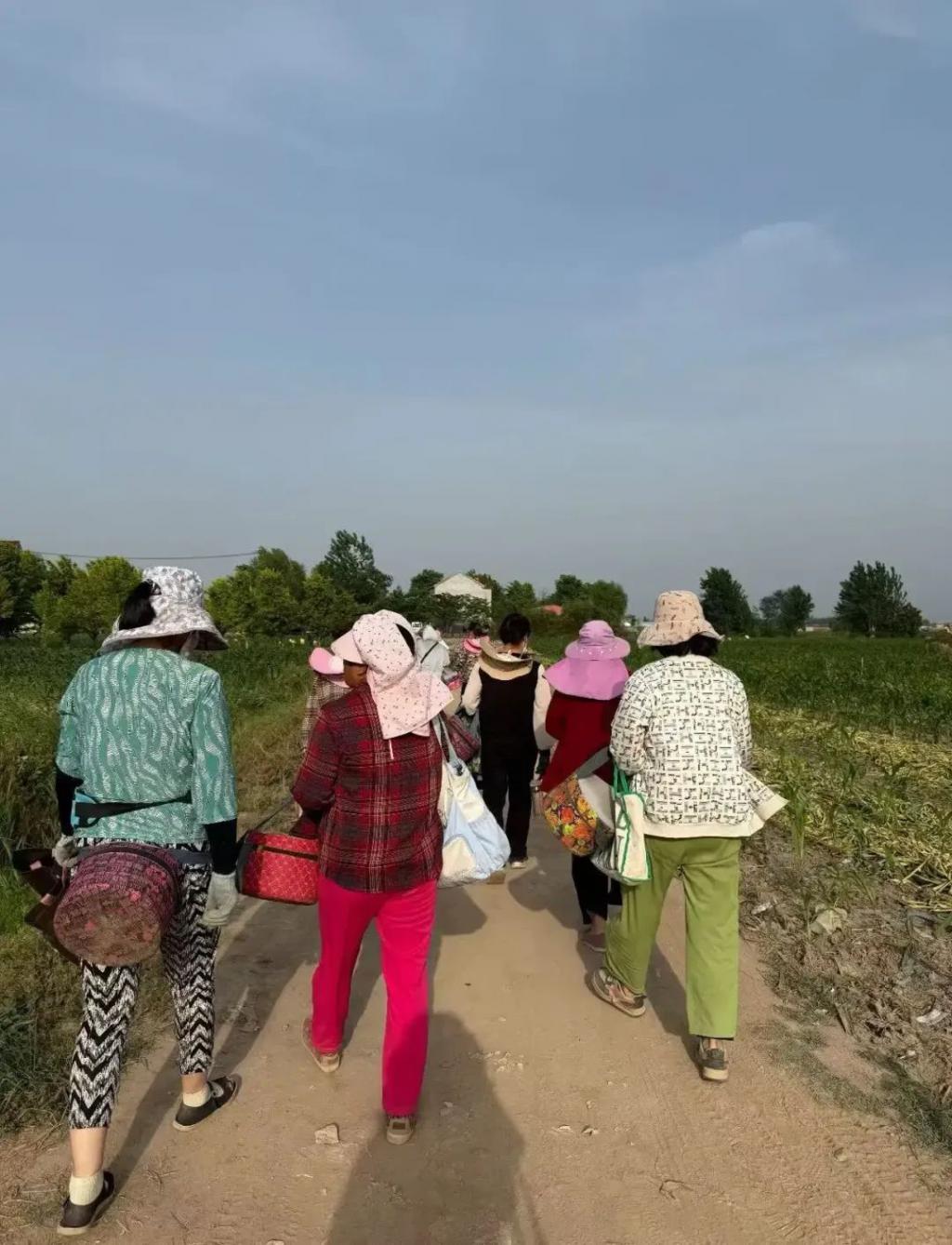 大姐、阿姨,劳务中介这样称呼女工们,她们也这样称呼自己。女工赵炎和郑红是同村,又是远亲,在车上座位紧挨着。此前,她们没人干过拔蒜的活,但都有多年务农经验,觉得"不是难事"。午后发车前,郑红特意拍了段短视频记录"出工"时刻,配文"出发邳州,大姐们加油"。