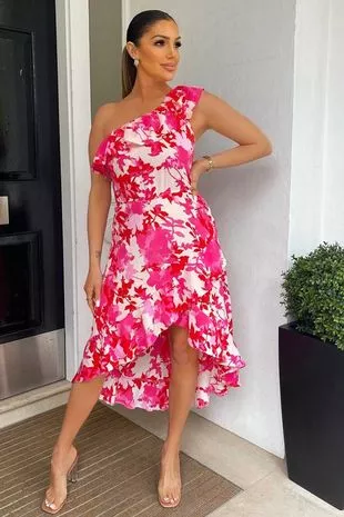 完整的产品描述是这样写的:“穿上这件粉色单肩连衣裙,引人注目的印花设计和可爱的褶边细节让人眼前一亮。配上绑带高跟鞋和闪闪发光的手包,每次都能穿出迷人的套装。”