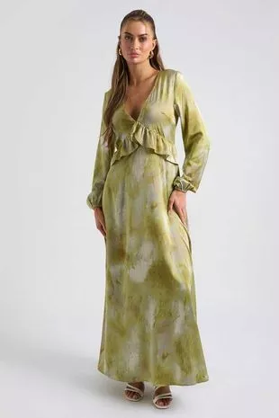 城市幸福绿色褶边及地长裙
