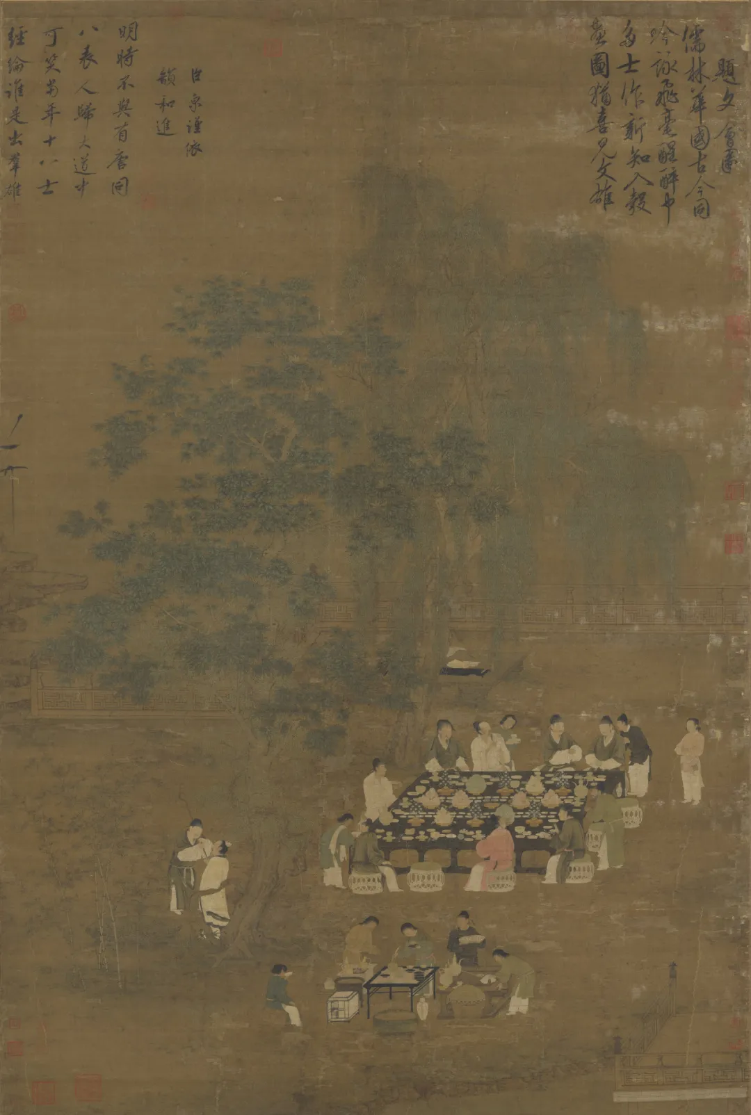 展出的《宋徽宗文会图》则描绘文人雅士会集于庭院饮酒赋诗的场面。经年的老柳古槐下,文人们铺陈巨案,案上的盘碟酒卮排列有序。案旁坐饮者、交耳相语者、顾盼者、持具侍者共十八人,另有两人树下立谈。