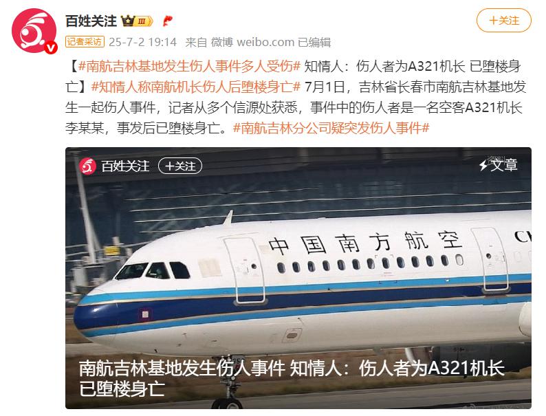 据贵州广播电视台公共频道百姓关注报道:7 月 1 日,吉林省长春市南航吉林基地发生一起伤人事件,记者从多个信源处获悉,事件中的伤人者是一名空客 A321 机长李某某,事发后已堕楼身亡。