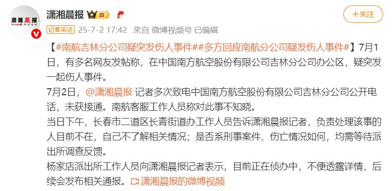 7 月 2 日,据潇湘晨报消息,记者多次致电中国南方航空股份有限公司吉林分公司公开电话,未获接通。南航客服工作人员称对此事不知晓。