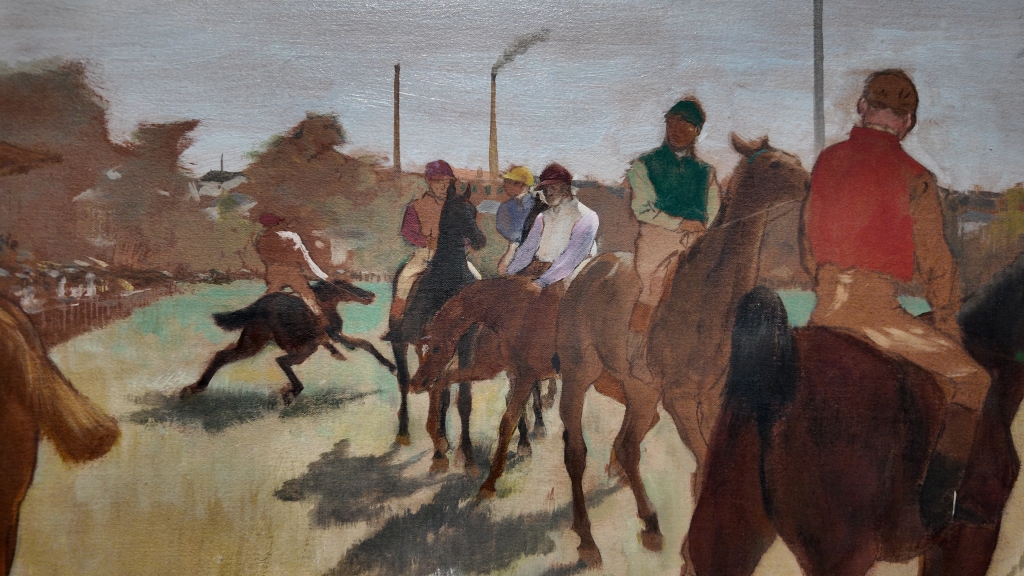 局部细节。在这幅画里,他就像站在赛马场的中间,准备和马儿一起冲出去。他喜欢描绘赛马开始前的准备阶段。