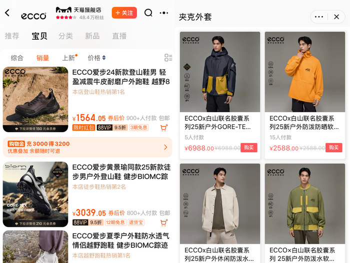 最直接的一点是,ECCO的运动类产品定价并不便宜。举例来看,其运动鞋类产品的价格主要集中在2000元到3000元间,联名的外套类产品基本在2000元以上,一些用到了GORE-TEX面料的冲锋衣定价在4000元到7000元不等,最贵的羽绒服则卖到了8000元以上。