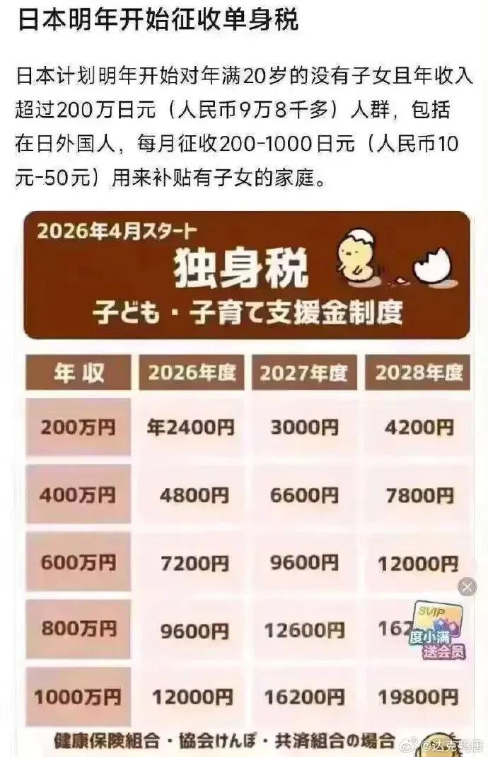 因此日本很多人质疑这政策对未婚群体没好处,反而带来了额外负担,毕竟大家真的多交了钱,于是衍生出 " 单身税 " 这样的表达。