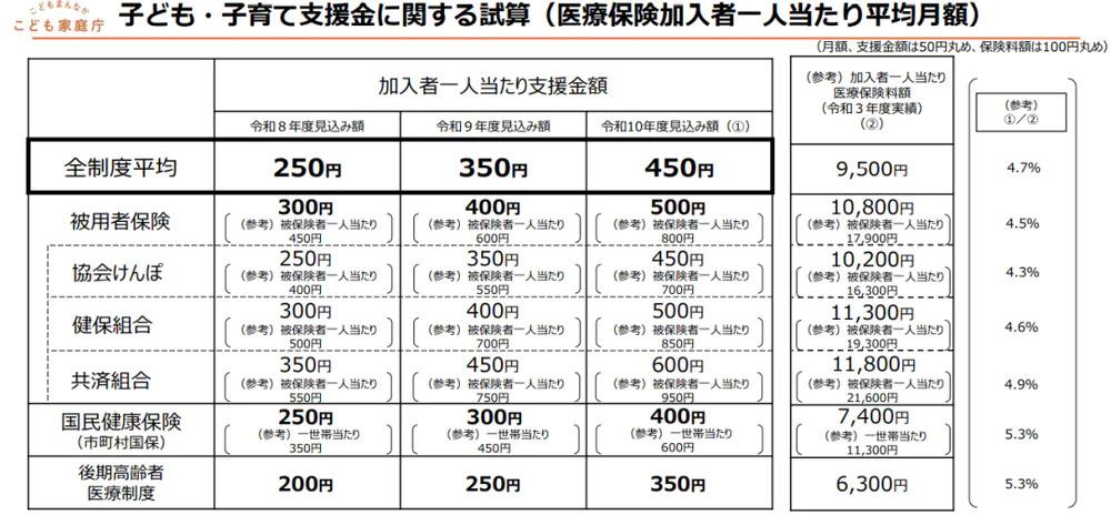 所以所有上班的人,无论是否结婚、是否有孩子,都要按照平均每月 250 日元(2026 年)至 450 日元(2028 年)的标准交钱。