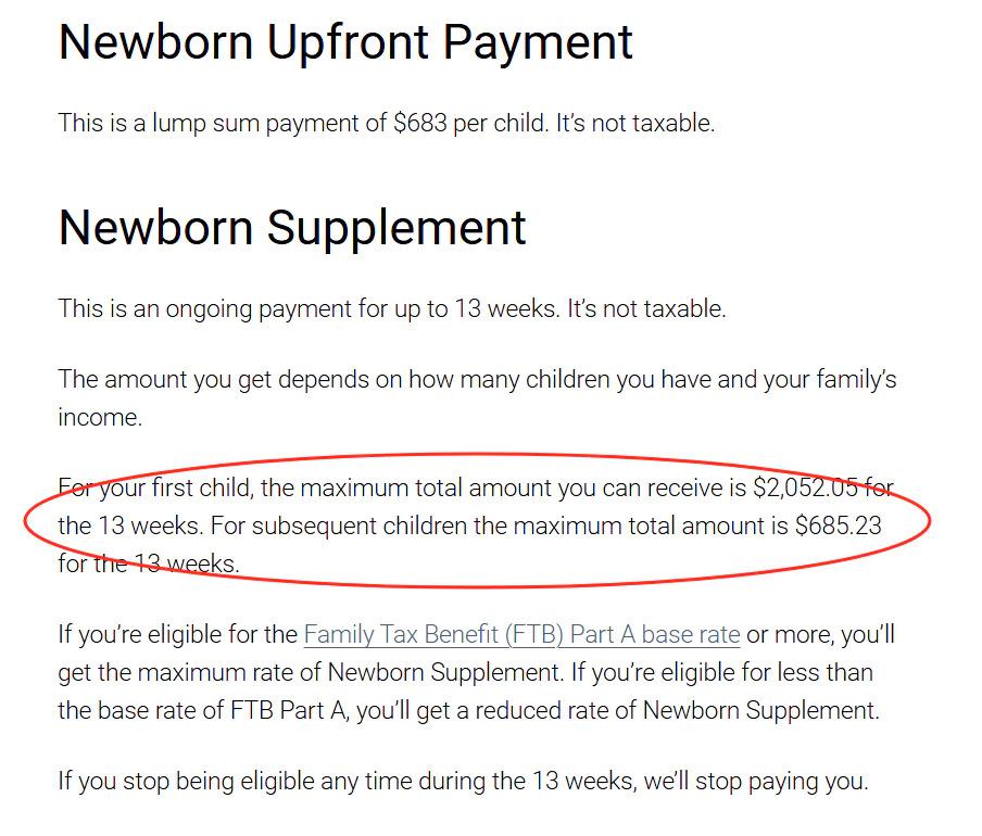 澳大利亚提供一次性补助之余,还会在孩子 13 周时,提供一笔最高 2,052.05 澳元补助。