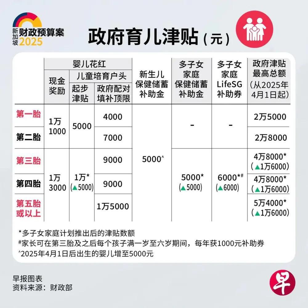 新加坡父母只要给小孩开设儿童培育户头,就能立刻拿到 5000 元的起步津贴。后面还会陆续发放保健津贴、多子女津贴等等。