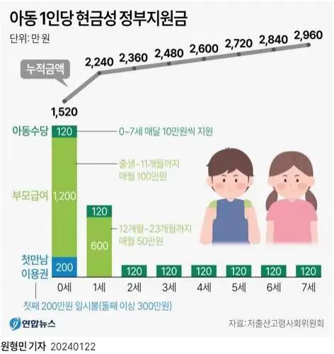 韩国孩子出生到 7 岁期间,能拿到总和为 2960 万韩元的补贴,相当于 15.6 万人民币。