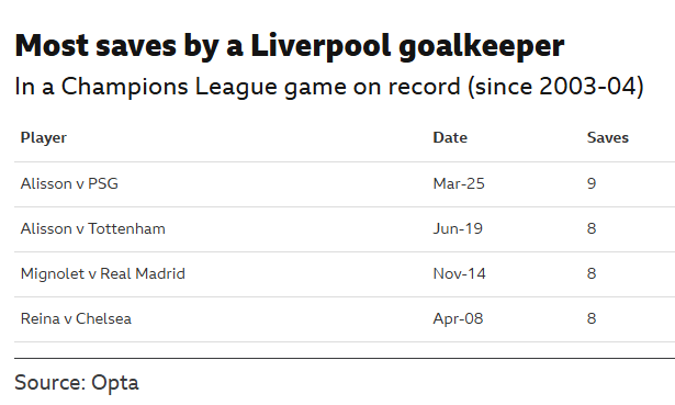 巴黎圣日耳曼在整场比赛中占据统治地位,全场射门27次,利物浦只有2次,但他们发现阿利森的状态非常出色。巴西门将完成了9次扑救,这是自2003-04赛季有记录以来利物浦门将在欧冠比赛中扑救次数最多的一次。