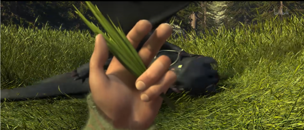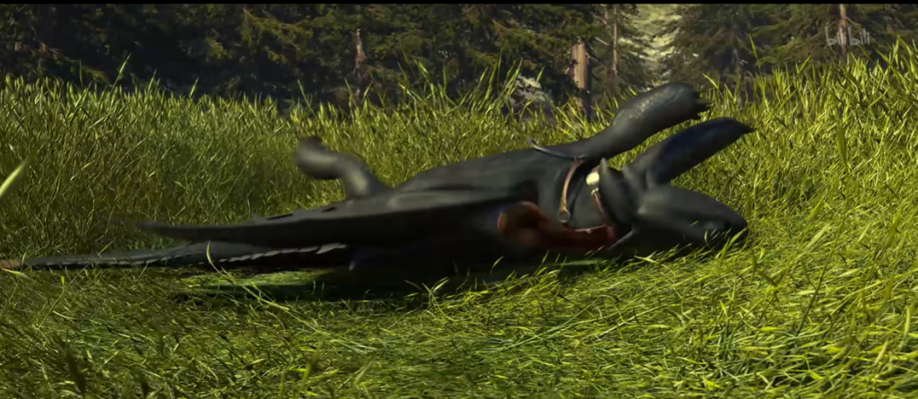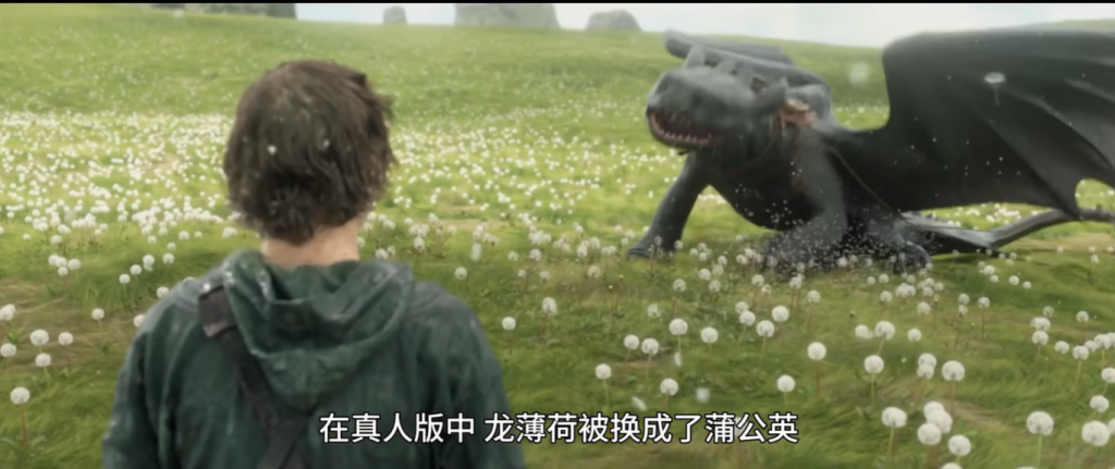 《新·驯龙高手》中该场景换成了蒲公英(dandelion),无牙仔也从放松变成打喷嚏(图源B站UP主@驯龙发现小队)