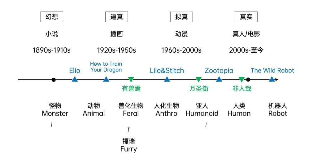 由此,福瑞生物的形态变化按照时间先后顺序与最佳媒介载体的技术发展,最终形成福瑞美学(Furry Aesthetic)的流变路径:怪物原型期(小说、1890s-1910s)→驯化萌芽期(插画,1920s-1950s)→猫狗福瑞期(动画,1960s-2000s)→拟人融合期(真人电影,2000s-至今)。