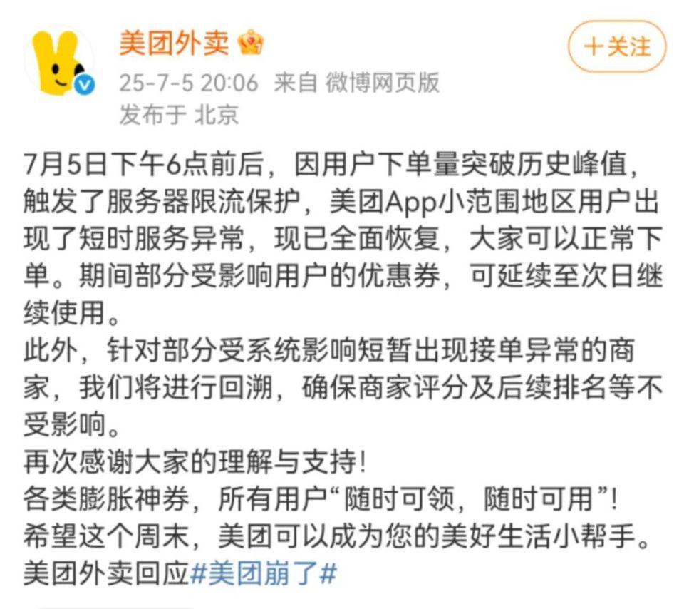 昨日晚间,随着优惠券的发放,不断有用户涌入美团下单,导致美团一度出现宕机。网友反映美团外卖点餐页面卡顿、优惠券使用异常,多次重试仍无法下单。对此,美团方面回应称,7 月 5 日下午 6 点前后,因用户下单量突破历史峰值,触发了服务器限流保护,美团 App 小范围地区用户出现了短时服务异常,现已全面恢复,大家可以正常下单。在此期间部分受影响用户的优惠券,可延续至次日继续使用。此外,针对部分受系统影响短暂出现接单异常的商家," 我们将进行回溯,确保商家评分及后续排名等不受影响 "。
