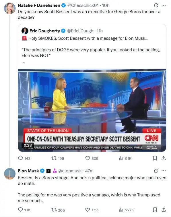 和美国总统特朗普闹翻后,马斯克与美国财长贝森特也隔空互怼起来了。