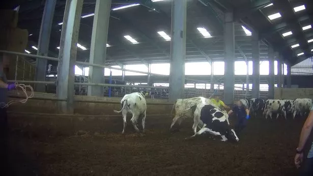 工人们被拍到鞭打奶牛,而其他人则被拍到踢打动物