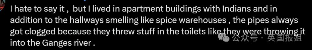 " 虽然我不想这么说,但我曾经和印度人一起住在公寓楼里,除了走廊里的气味像是香料仓库之外,管道也总是被堵塞,因为他们总是把各种东西扔进厕所,就像扔进恒河一样。"