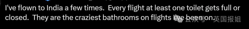 " 飞过几次印度,每次飞至少有一个厕所是爆满或者关上的,见识了我坐过的所有航班中最疯狂的厕所。"