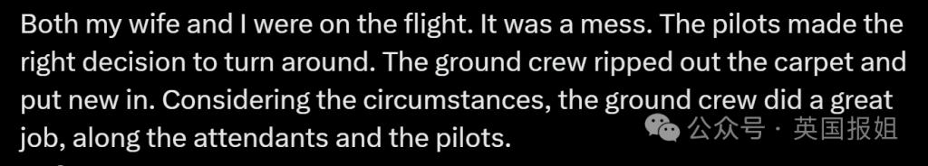 " 我和妻子都在飞机上。飞机上一片混乱,乘务员做出了正确的返航决定。
