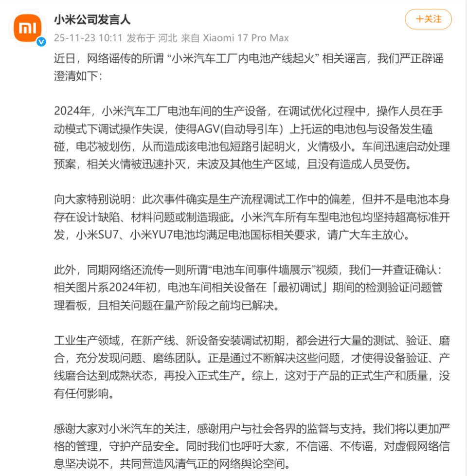 网传“小米汽车工厂内电池产线起火”,小米官方澄清生活