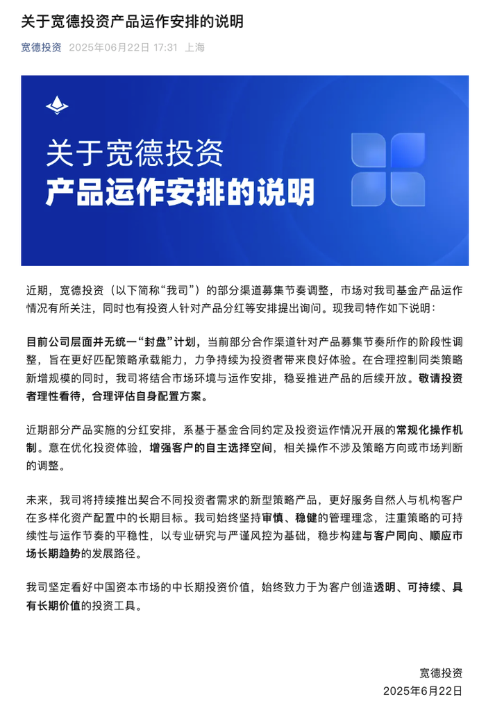 就市场传出“封盘”和产品分红的消息,6月22日,宽德投资发布公告称,目前公司层面并无统一“封盘”计划...