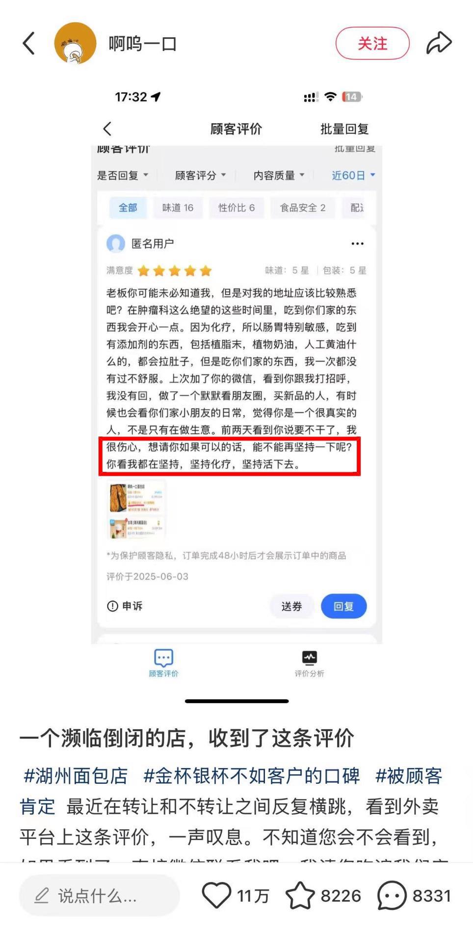 "一个濒临倒闭的店,收到了这条评价",近日,浙江湖州一家面包店店主发布的帖子引发...