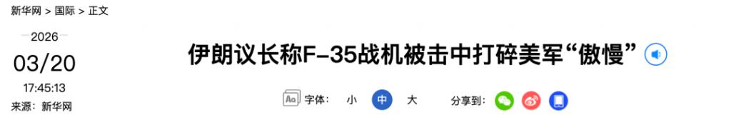 新华社消息,伊朗伊斯兰议会议长卡利巴夫20日说,F-35战机首次被击中,打碎了美军的"傲慢...